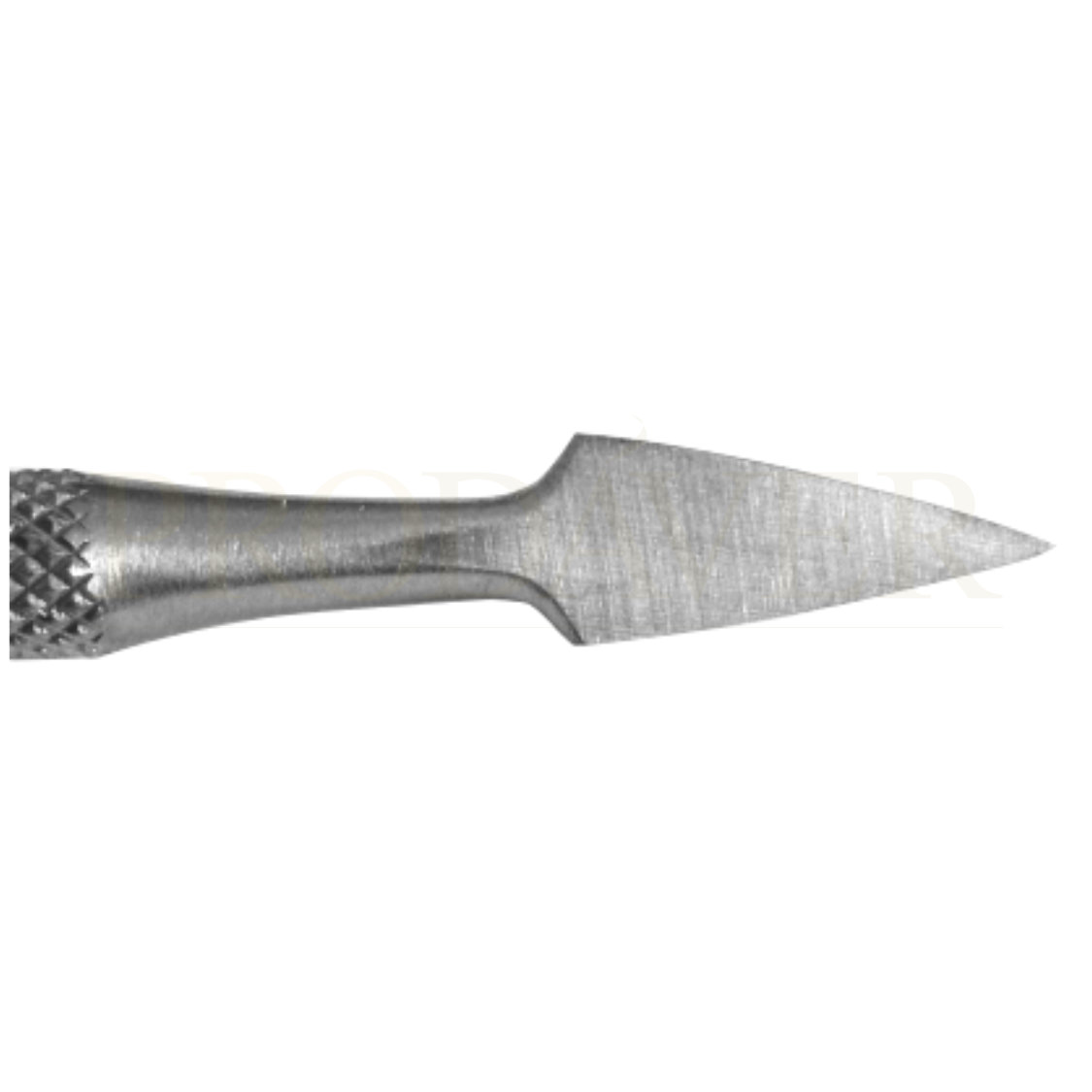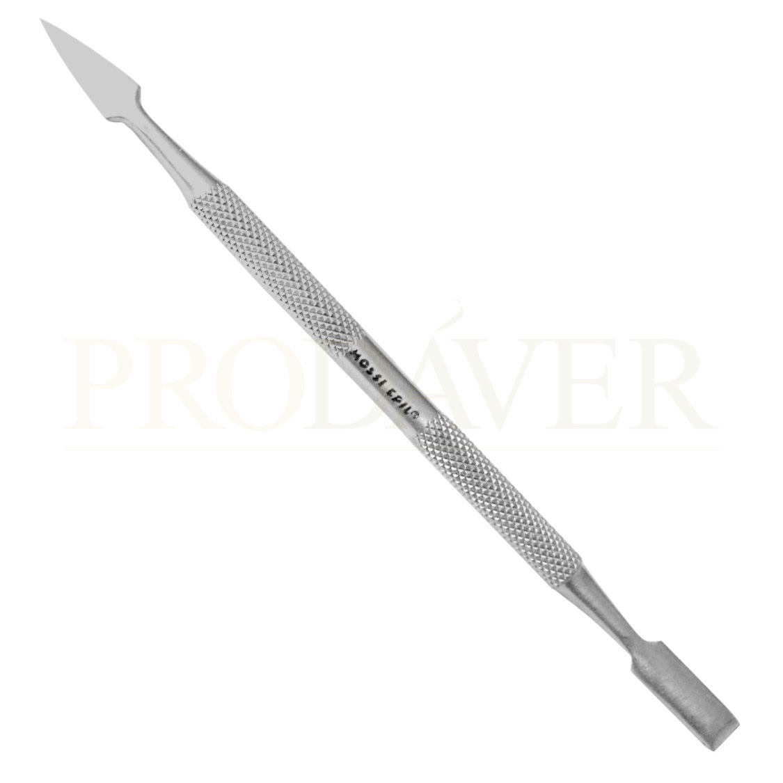 Empurra cutículas com ponta quadrada e outra ponta de bico. O bico serve para limpar à volta da unha ou debaixo da parte frontal das unhas. Prodáver