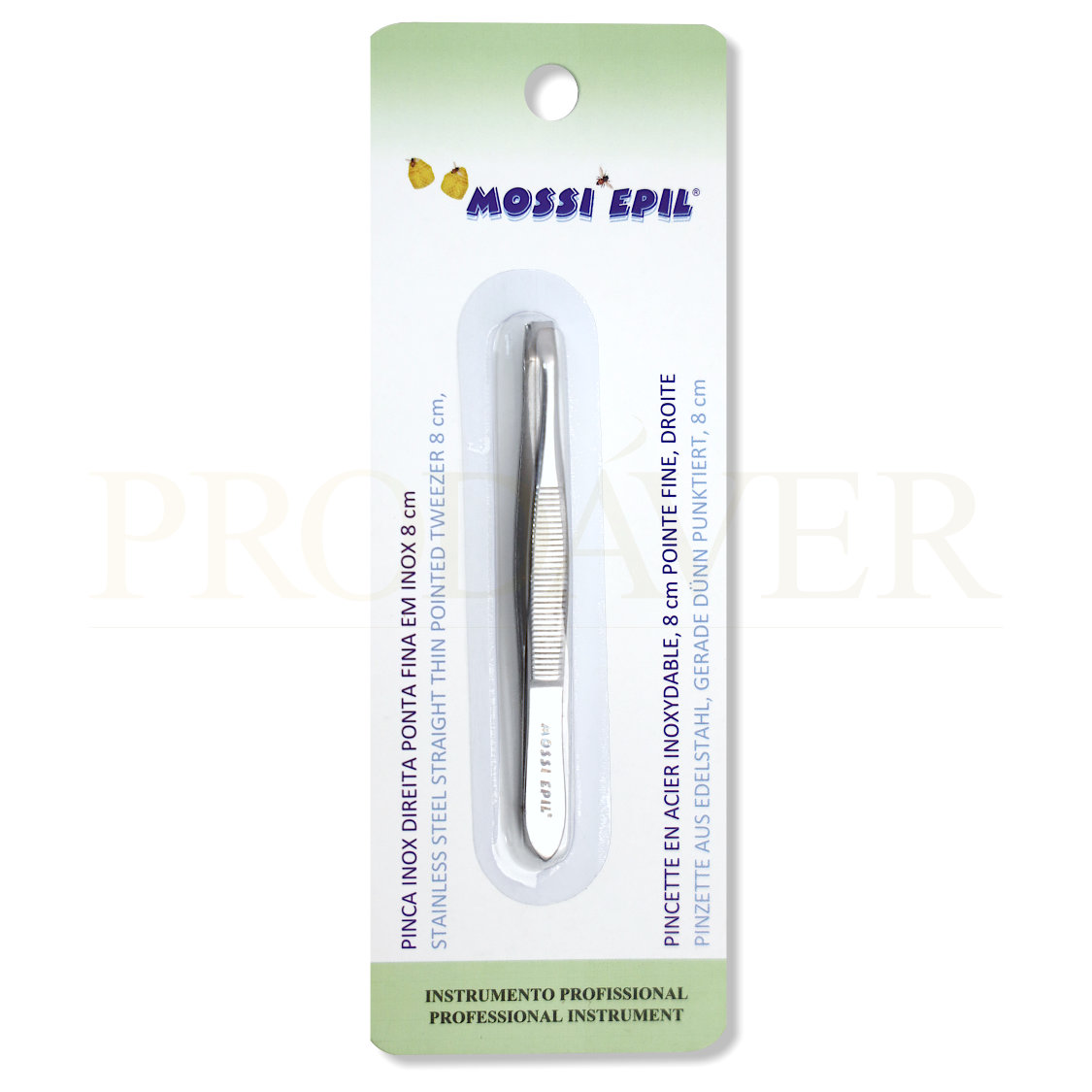 Pinça curvada com pontas direitas, fina. A pinça tem um comprimento de 8cm. Prodáver