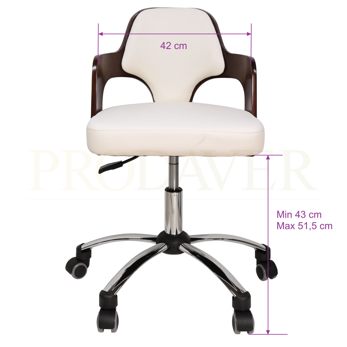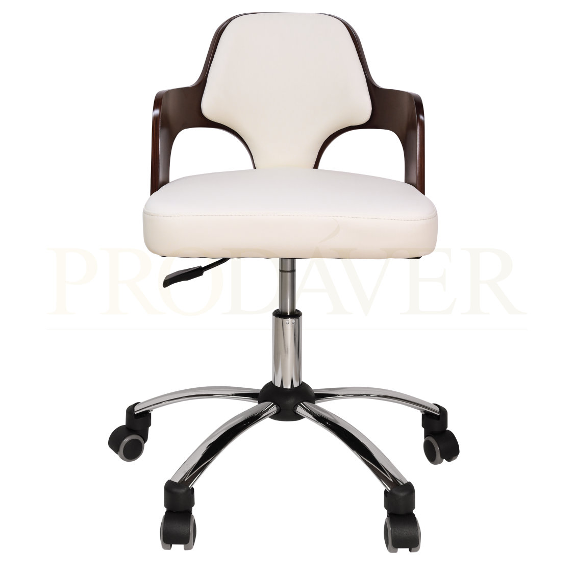 Cadeira hidráulica extremamente confortável com um estilo moderno. Contém uma patilha para elevação. O encosto é curvado, e base do assento é plana, arredondada na parte de trás e quadrada à frente do assento. Napa de PVC. Madeira de contraplacado marítimo. Base cromada da cadeira, consiste de 5 "braços" com as respetivas rodas. Ideal para o uso em salas de espera. Prodáver