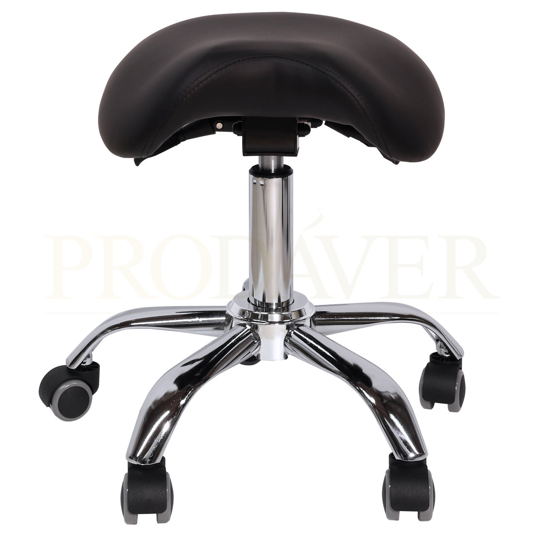 Banco de sela hidráulico. Contém duas patilhas: uma para elevação e outra para declinar a ponta da frente do banco, caso o/a profissional esteja a trabalhar inclinado para a frente. A parte frontal do banco é ergonómica contornando para o interior do centro do banco para que se torne mais confortável e crie menos pressão nas virilhas. Napa de PVC. Base do banco cromada, consiste de 5 "braços" com as respetivas rodas. Prodáver